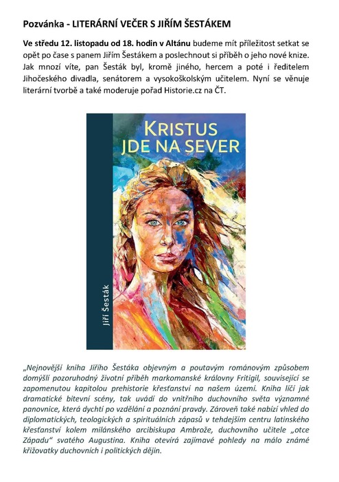Úvod > Aktuality > LITERÁRNÍ VEČER S JIŘÍM ŠESTÁKEM 12.11. od 18h v Altánu