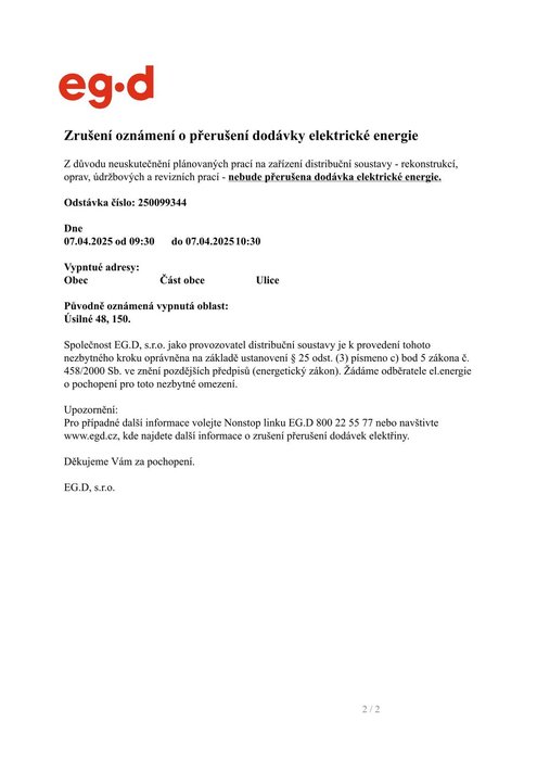Úvod > Aktuality > Zrušení oznámení o přerušení dodávky elektrické energie